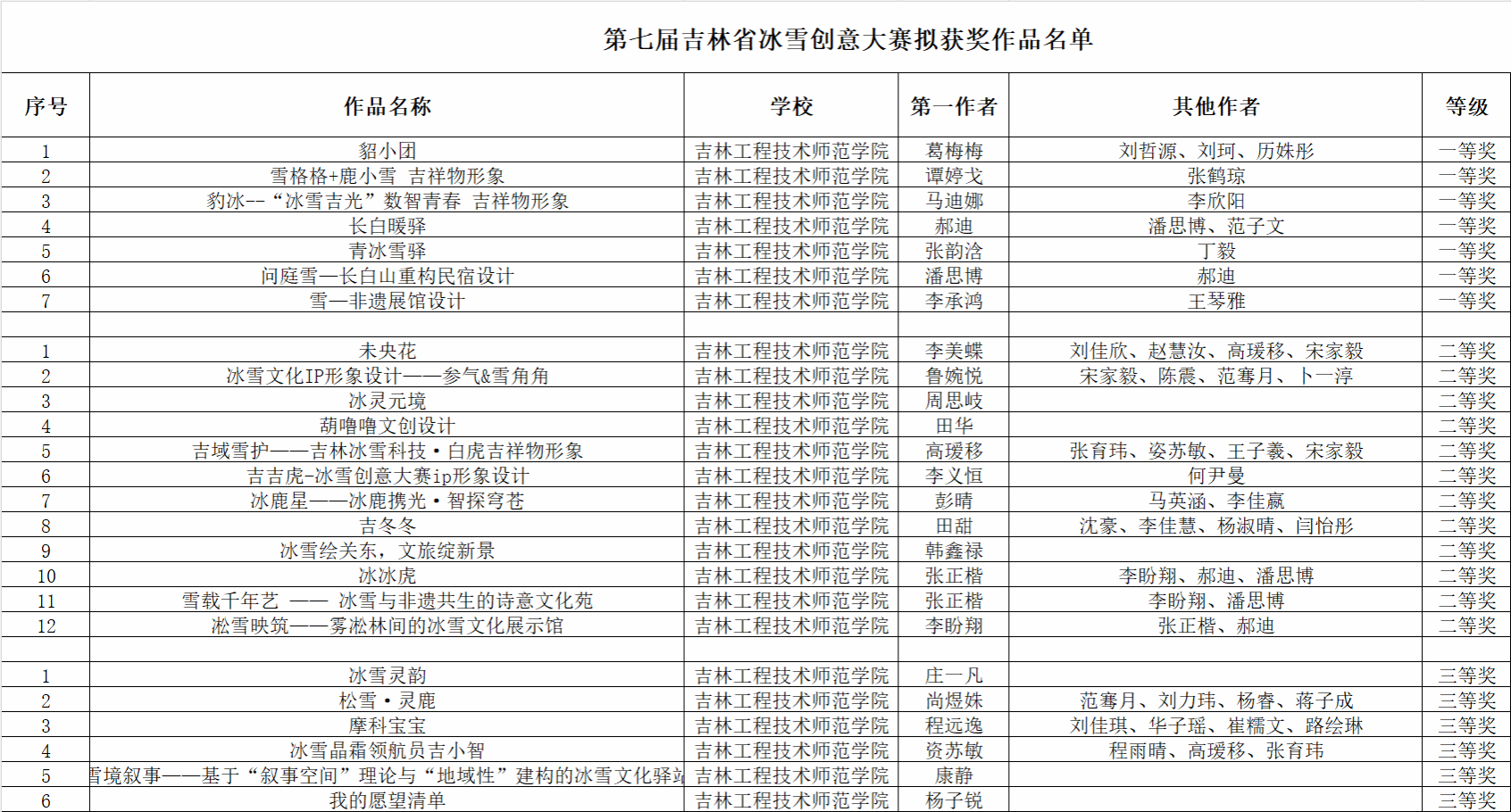 近日,第七届吉林省高校冰雪创意大赛获奖结果正式公布。艺术与设计学院获奖25项,获奖数量与层次均创近年新高,其中一等奖7项、二等奖12项、三等奖6项,充分展现了学院专业教学成果与师生创意实力。