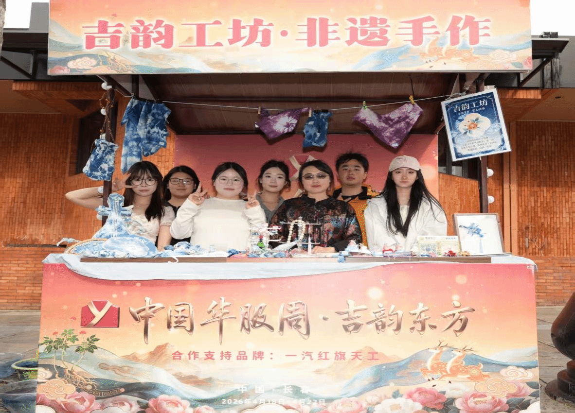 4月18 日至19 日,2026中国华服周・吉韵东方在长春新民大街正式启幕。本次活动串联长春多处地标街区,以华服为纽带,青年学子在穿搭体验、礼仪学习、文化互动中沉浸式感受中华优秀传统文化的深厚底蕴。艺术与设计学院工艺美术工作室师生团队携非遗手作精品亮相国风市集,将课堂匠心转化为文创佳作,以青春创意点亮国潮风尚,集中展现学院非遗美育与实践教学成果。