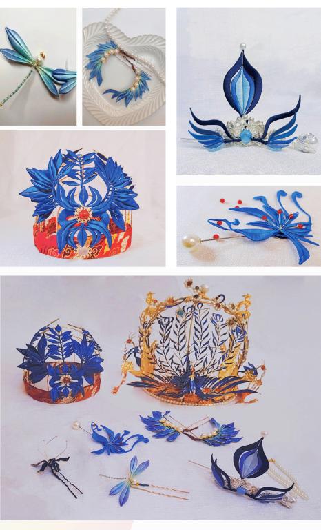 《缠情》 来源:工艺美术 2022/06/27 学生姓名:刘业君 指导教师:袁国艳 设计说明:缠花工艺是非物质文化遗产,选择缠花工艺进行深入的研究,对传承和发展传统工艺而言也意义深远。缠花外型别具一格,有着“线艺雕塑”的称号。根据吉林历史文化与生态文化,在毕业设计作品上选择明朝、清朝、北宋人物发饰形式与吉林生态相结合,做头冠、发簪等一系列物品,使传统缠花的应用融入到现代生活中,焕发新的生机。